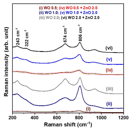Figure 3 presents the Raman spectra of the WO3 nanosheet arrays and the WO3/ZnO nanocomposites, measured at room temperature in the range of 200–1200 cm−1. As shown in the figure, characteristic Raman signals appear at 674 and 809 cm−1, corresponding to the stretching and bending vibrations of W–O–W bonds in the WO3 nanocrystals []. However, no Raman peaks associated with ZnO nanocrystals are detected in the spectra of the WO3/ZnO nanocomposite samples. Despite this, the previous XRD analysis confirmed the presence of the ZnO phase by identifying diffraction peaks corresponding to the (100) and (110) planes. Furthermore, the SEM-EDS spectra confirm the presence of W, O, and Zn elements in the synthesized WO3/ZnO nanocomposites, verifying the successful incorporation of ZnO into the composite structure. The absence of ZnO-related Raman signals is likely due to the relatively low ZnO concentration in the WO3/ZnO nanocomposites. This interpretation is supported by the XRD results, where the ZnO (100) and (110) diffraction peaks are much weaker than those of the WO3 phase, suggesting that the ZnO content is insufficient to generate detectable Raman signals under the measurement conditions used.