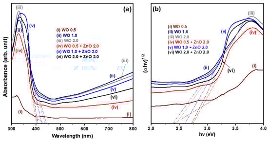 (a) UV-Vis diffuse reflectance absorption spectra and (b) the corresponding Tauc plots for WO3 nanosheet array samples and WO3/ZnO nanocomposite samples.
