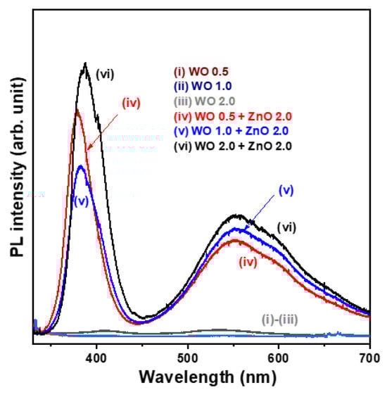 The photoluminescence (PL) spectra of the nanostructural oxide samples measured at room temperature are shown in Figure 5. The WO3 nanosheet array samples exhibit very weak PL signals (spectra (i)–(iii)). On the contrary, all WO3/ZnO nanocomposite samples display two prominent emission peaks, including a near-ultraviolet emission peak at approximately 355.4 nm, attributed to near-band edge transitions, and a broad, intense visible emission band ranging from 450 to 650 nm, which is generally associated with crystal defects (spectra (iv)–(vi)). The significantly enhanced PL emission intensity observed in the WO3/ZnO heterostructure samples can be attributed to the direct optical bandgap nature of ZnO, which facilitates the generation of electron-hole pairs upon photoexcitation. The broad visible emission band in the 450–650 nm range (yellow-green light region) is likely due to oxygen vacancies and tungsten interstitials. As the growth time of the WO3 nanosheet arrays in the WO3/ZnO nanocomposite samples increased from 0.5 to 2.0 h, the near-UV PL emission peak exhibited a slight redshift. Furthermore, the intensity of the defect-related visible emission band increased markedly, indicating a higher rate of photogenerated electron-hole pairs with an increased WO3 content. This suggests that the WO 0.5 + ZnO 2.0 sample exhibits (spectrum (iv)) the lowest electron-hole recombination rate among the tested samples.