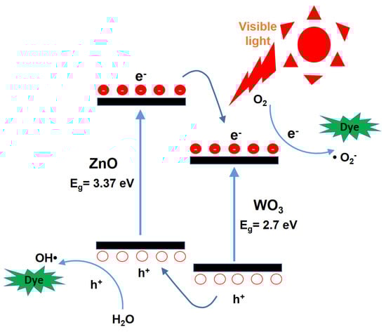 Figure 6 presents a schematic energy band diagram of the ZnO/WO3 heterojunction, illustrating the charge transfer process and the reactions of photogenerated electrons and holes with surface-adsorbed oxygen and water molecules on the nanocatalysts, respectively. It is well-known that photogenerated electrons in the conduction band (CB) of ZnO can rapidly transfer to the CB of WO3, while the corresponding photogenerated holes in the valence band (VB) of WO3 migrate to the VB of ZnO due to the favorable band alignment of the heterojunction [,]. Electrons react with oxygen molecules adsorbed on the nanocatalyst surface to generate superoxide anion radicals (•O2−), while holes oxidize water molecules to produce hydroxyl radicals (•OH) []. These reactive oxygen species possess strong oxidative capabilities, enabling the degradation of organic dyes into smaller, nontoxic molecules such as carbon dioxide and water []. This charge separation and reactive radical generation mechanism is considered a key factor contributing to the enhanced photocatalytic performance of heterojunction-based composite photocatalysts.