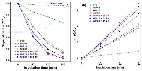 Wastewater from industries such as textiles, food processing, papermaking, printing, leather, and cosmetics often contains azo dyes. The direct discharge of such untreated wastewater into rivers poses a serious threat to aquatic ecosystems and human health, due to the potential for biological mutations and carcinogenic effects. Consequently, photocatalytic degradation studies frequently employ model pollutants such as methylene blue (MB), methyl orange (MO), and rhodamine B (RhB) []. Figure 7a illustrates the degradation rate of aqueous MB solutions under visible-light irradiation using WO3 nanosheets and WO3/ZnO nanocomposites, plotted as a function of the irradiation time. To evaluate the effect of photocatalysts on the degradation of MB dye, an experiment without any photocatalyst was performed. In the absence of a photocatalyst, the degradation rate of MB dye was negligible, reaching only about 3.6% after 180 min of illumination. For comparison, the photocatalytic performance of FTO glass was also measured as a reference. After 180 min of visible-light illumination, the FTO glass exhibited a degradation rate of only approximately 20%. The three pure WO3 nanosheet samples showed similar photocatalytic performance, with degradation efficiencies ranging from 84.5% to 86.0%, indicating minimal variation among them. In contrast, the WO3/ZnO nanocomposite samples exhibited significantly enhanced degradation efficiency compared to the pure WO3 samples. This improvement can be attributed to the higher specific surface area of the nanocomposites, which provides more active sites during the photoelectrochemical reactions. Additionally, the formation of WO3/ZnO heterojunctions effectively suppresses the recombination of photogenerated electron-hole pairs, a key factor contributing to improved photocatalytic activity. Among those oxide semiconductor photocatalysts, the WO 0.5 + ZnO 2.0 nanocomposite exhibited the highest photocatalytic performance, achieving an MB degradation efficiency of 96.7% after 180 min of visible-light irradiation.