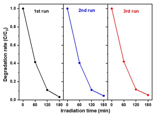 Recycling photodegradation characteristics of the WO3/ZnO nanocomposite photocatalyst, with WO3 grown for 0.5 h and ZnO for 2.0 h, evaluated for degradation of 10 ppm MB aqueous solution under visible-light irradiation.