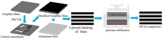 The composite was then prepared as follows. To ensure proper infiltration, infiltration channels were pre-fabricated within the graphite films by adding aluminum foils. The graphite films and aluminum foils were alternately stacked layer by layer, with a total of 50 graphite films and 52 aluminum foils stacked to form a preform approximately 3 mm thick. The composite material was then prepared using the pressure infiltration method with 6063 aluminum solution. The schematic illustration is shown in Figure 1.