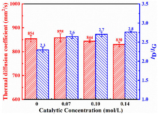 The effects of different Ni catalyst concentrations on the modification results are shown in Figure 2b–d. As the catalyst concentration increased, the density of carbon nanosheets did not change significantly, but the flatness and length of the carbon nanosheets increased, although the overall variation was limited. The catalyst’s stronger ability to absorb active carbon species led to the carbon nanosheets growing more preferentially along the sheet direction, rather than nucleating at multiple sites. With increasing catalyst concentration, the thermal diffusion coefficient of the modified graphite film decreased, while the defect density increased.