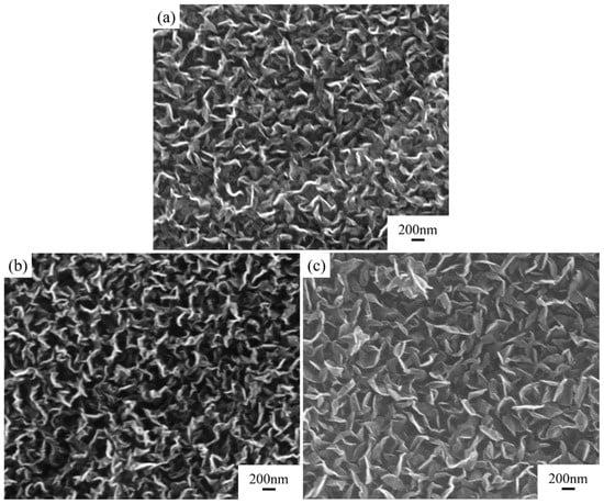Comparison of structure and properties of carbon nanosheet-modified graphite film pretreated under different grown gas flow rates. SEM images of modified graphite film prepared with CH4:H2 gas flow rate of (a) 12:3 sccm, (b) 16:4 sccm, and (c) 20:5 sccm.