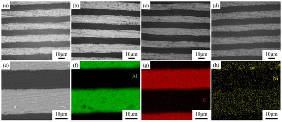 Metallographic structure and SEM image of GF/Al composites with surface-modified carbon nanosheets prepared under different processes. Metallographic structure of (a) GF/Al, (b) CNS-1, (c) CNS-2, (d) CNS-3; (e) SEM image of CNS-2; EDS mapping of (f) Al, (g) C, and (h) Ni.