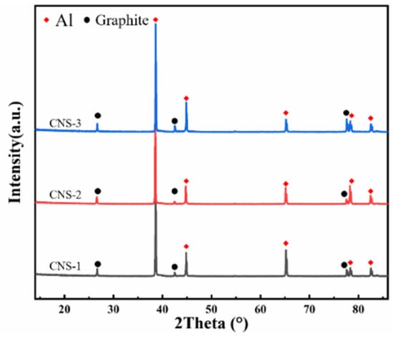 XRD pattern of GF/Al composites modified with carbon nanosheets using different processes.