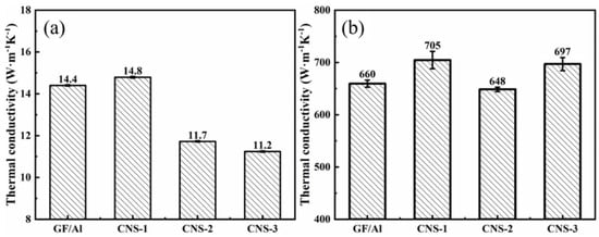 Although the introduction of the catalyst reduces the thermal conductivity of the aluminum matrix, the matrix’s contribution to the overall thermal conductivity in the xy-direction is minimal due to the different heat transfer paths. Thus, in the CNS-2 process, the xy-direction thermal conductivity of the composite still improves. After modification with the CNS-2 process, the thermal conductivity of the GF/Al composite slightly decreases from 660 W/(m·K) to 649 W/(m·K). However, after modification with the CNS-3 process, the thermal conductivity of the GF/Al composite increases from 660 W/(m·K) to 697 W/(m·K).