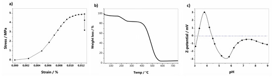 GO-BPs: stress vs. strain curve (a), TGA (b), and Z potential (c).