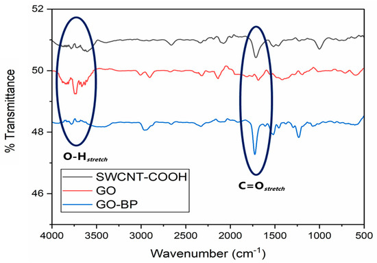 FT-IR spectra of SWCNTs-COOH (black), GO (red), and GO-BPs (blue).