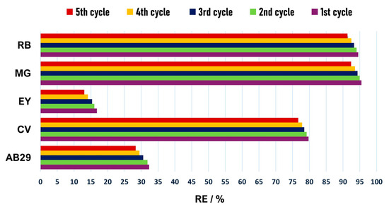 Considering stability and efficiency over long-term use, GO-BP membranes were recycled and reused in successive adsorption tests, repeating experiments for each dye at 50 mg L−1 for five times. Regeneration step was performed by washing GO-BP membranes at the end of each adsorption cycle with an ethanol:water (2:1) solution for three times, and then drying GO-BPs at room temperature. With a discrepancy in RE% values of 4% at maximum between the first and last cycle, recycle experiments ascertained the reusability of GO-BP membranes for subsequent adsorption tests, maintaining their recovery percentages (Figure 6) towards dyes up to five times from the first experiment.