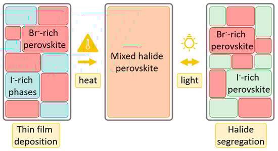 Ion migration occurs within the perovskite films. Ion migration is a potential source of instability, highlighting the importance of further elucidating this process to develop strategies for improving photostability [54]. Uniformly mixed halide perovskites (e.g., APb(I1−xBrx)3) can reversibly segregate under continuous visible-light irradiation into narrow-bandgap I-rich domains and wide-bandgap Br-rich domains (Figure 1). This light-induced halide segregation is essentially a result of ion migration. Iodine-rich domains reduce the local open-circuit voltage (VOC) and lower the power conversion efficiency of mixed-halide perovskite solar cells [55]. For phase-unstable wide-bandgap perovskite films, when more than 20% of bromide (Br) is substituted by iodide (I) to widen the bandgap, phase separation under illumination readily occurs, forming Br-rich domains with higher bandgaps and I-rich domains with lower bandgaps. In such cases, the iodide-rich regions exacerbate the open-circuit voltage (VOC) deficit and compromise device stability [56].