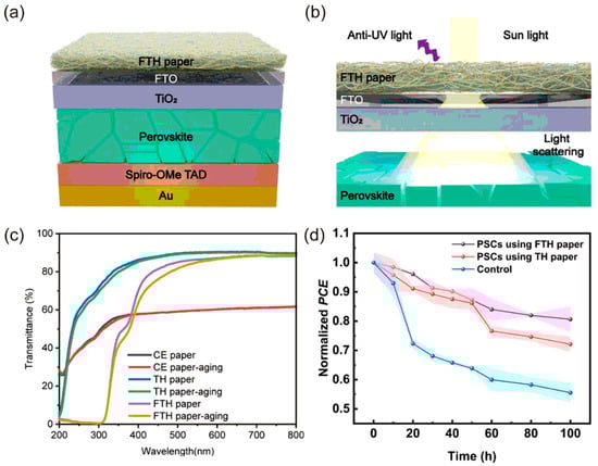 Si et al. developed a functional cellulose paper (FTH paper) with high transparency, high haze, and UV-blocking capability, suitable for industrial production as a paper-based coating for PSCs (Figure 2). It can be attached to FTO or ITO glass surfaces using a 10 wt% PVP solution, effectively extending the operational lifetime of PSCs and significantly enhancing their optical path length and UV stability (with a 26% improvement after 100 h) [59]. When the impregnation amounts of carboxymethyl cellulose and tannic acid were 16 wt% and 0.7 wt%, respectively, the transmittance and UV-blocking efficiency reached 86.8% (at 600 nm) and 83.1% (at 320 nm), respectively, while maintaining a haze of 71.5%. After protonation and desalination treatments, the FTH paper exhibited excellent water resistance and mechanical properties (71.49 MPa tensile strength, 2156 folding cycles) [59].