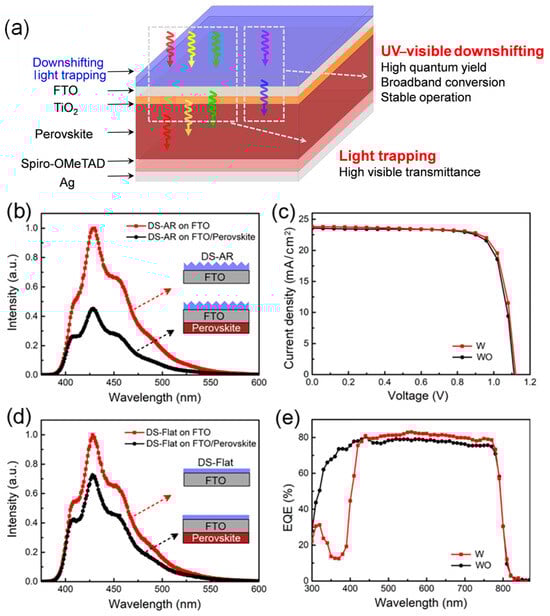 (a) Schematic drawing of perovskite solar cells with a spectral modification layer. (b) Photoluminescence (PL) spectra of DS-AR (down-shifting anti-reflection) coatings on FTO substrates with and without perovskite films. (c) J-V curves. (d) UV stability of PSCs with and without DS-AR layers. (e) External quantum efficiency (EQE) spectra. Reproduced with permission from [62], Copyright 2021, Elsevier.