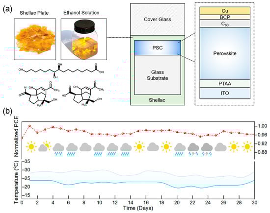 Shellac-based encapsulation process and outdoor stability of PSCs. (a) Schematic illustration of the shellac-based encapsulation process. PSCs are covered with a shellac film (20–50 μm thick) by spray-coating or drop-casting methods, followed by covering with a cover glass. (b) Outdoor stability of SE modules according to the MQT 08 (IEC 61215) protocol. Reproduced with permission from [63], Copyright 2024, Elsevier.
