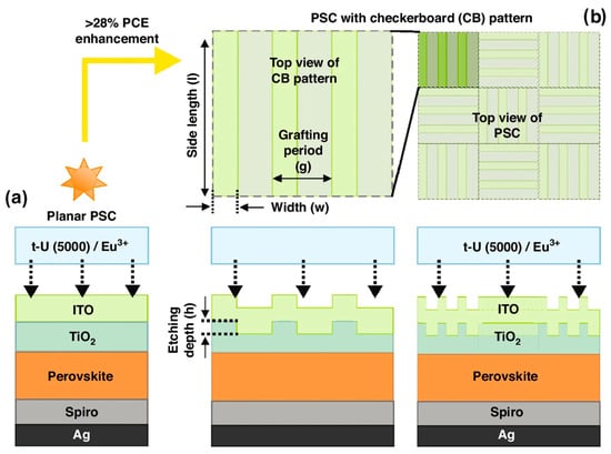 Mendes et al. [71] proposed a chessboard (CB) tiling pattern specifically designed for UV photon conversion (Figure 5). This photonic structure enhanced the photocurrent and PCE of ultrathin PSCs by 25.9% and 28.2%, respectively. They also identified a luminescent down-shifting encapsulant capable of converting UV irradiation into visible photons that match the absorption spectrum of the solar cells. The absorption and emission profiles of state-of-the-art down-shifting materials—specifically, lanthanide-based organic–inorganic hybrids—were experimentally obtained and used to predict the potential gains from UV energy utilization. It was demonstrated that at least 94% of incident UV radiation could be effectively converted into the visible spectral range. By integrating light harvesting with luminescent down-shifting layers, a potential photonic solution was revealed that could overcome UV-induced degradation in PSCs while mitigating optical losses in ultrathin cells, thereby improving both performance and stability.