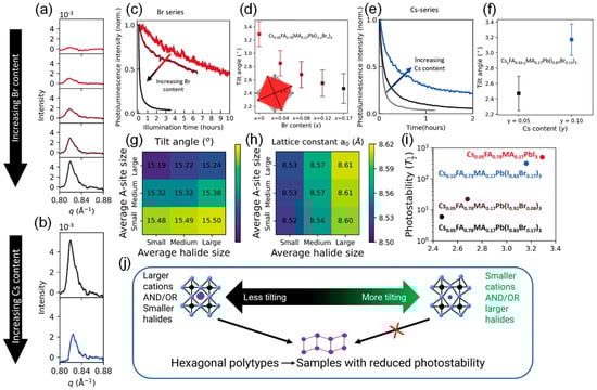 Figure 6 illustrates the effects of Br and Cs content on photostability, octahedral tilting, and the formation of hexagonal polytypes, as well as the role of composition in modulating octahedral tilt angles and photostability. The presence of Br leads to decreased photostability [75]. The spectral integral intensities of the components with x = 0, x = 0.08, and x = 0.17 are plotted as a function of time. Br addition leads to an increase in the photodegradation rate over time under illumination. Br addition leads to the formation of more hexagonal polymorphic phases. The GIWAXS scattering intensity graphs integrate patterns displaying the Bragg peaks of the perovskite hexagonal polymorphic phase. Weak but detectable scattering intensities were observed in the range of 0.80 ≤ q ≤ 0.88 Å−1, corresponding to the hexagonal polymorphic phase with the space group P63/mmc (2H to 6H), composed of face-shared [PbI6]4- octahedra [76]. With the increase in Br content, an increase in scattering intensity within this range was observed. Similarly, Cs exhibits the opposite effect to Br.