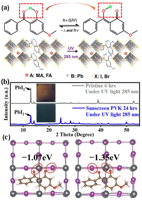 (a) Preparation and dynamic properties of sunscreen PSCs. (b) XRD spectra of perovskite films with and without “sunscreen” under UVB 285 nm illumination. (c) DFT calculations of the sunscreen isomeric molecules for Pb antibody surface passivation. Reproduced with permission from [79], Copyright 2021, Wiley-VCH GmbH.