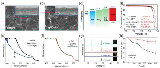 (a) Top-view and cross-sectional (inset) SEM images of perovskite films on SnO2 and (b) CsI-SnO2. The scale bar represents 500 nm. (c) Schematic energy level diagram. (d) J-V curve of the best-performing PSC measured. (e) UV–visible absorption spectra of original and UV-aged perovskite films based on SnO2 and (f) CsI-SnO2 ETLs. (g) XRD spectra and corresponding photos of original and UV-aged perovskite films based on SnO2 and CsI-SnO2 ETLs. (h) Normalized PCE decay curves of SnO2- and CsI-SnO2-based PSCs under 365 nm UV exposure. Aging tests were conducted in a N2 glovebox. Reproduced with permission from [80], Copyright 2022, Wiley-VCH GmbH.