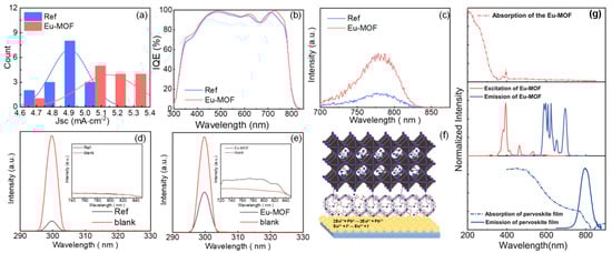(a) Efficiency histogram of integrated photocurrent density in the 300–500 nm range. (b) IQE spectra. (c) Emission PL spectra under 250 nm excitation. Perovskite films: (d) without Eu-MOF and (e) with Eu-MOF, for PLQE measurements under 300 nm excitation. (f) Schematic diagram of the effect of Eu-MOF on perovskite films. (g) Spectra of different compositions: Eu-MOF UV absorption spectrum (top), Eu-MOF excitation spectrum (middle, red curve), and emission spectrum (middle, blue curve); FAMAC perovskite film absorption (bottom, dashed line) and emission (bottom, solid line) spectra. Reproduced with permission from [81], Copyright 2021, Wiley-VCH GmbH.