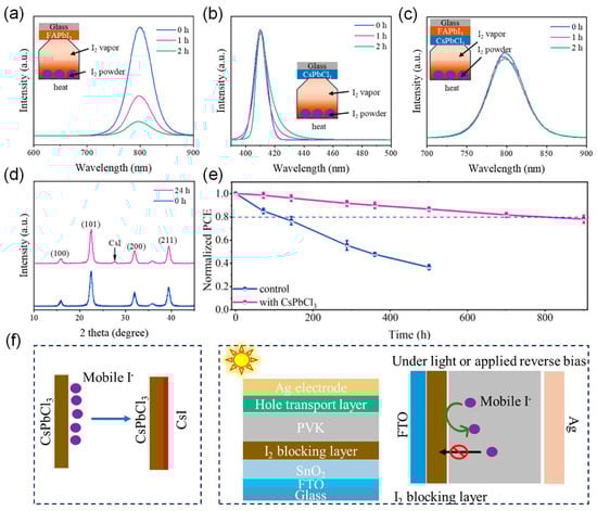 (a,b) PL spectra of FAPbI3 and CsPbCl3 films under I2 vapor exposure for different times. Inset: Schematic diagram of I2 vapor exposure to perovskite films in the dark and in a nitrogen-filled glovebox. (c) PL spectra of CsPbCl3/FAPbI3 under I2 vapor exposure for different times. (d) XRD spectra of CsPbCl3 perovskite after more than 24 h of I2 vapor exposure. (e) Normalized PCE of unencapsulated PSCs under 365 nm UV exposure. (f) Mechanism of CsPbCl3 used as an I2 blocking layer. Reproduced with permission from [86], Copyright 2025, Wiley-VCH GmbH.