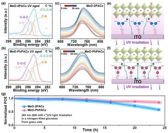 Gao et al. synthesized a novel SAM compound, MeO-PhPACz, based on fully aromatic carbazole and found that MeO-PhPACz exhibits intrinsic UV resistance and enhanced UV absorption, significantly improving the UV resistance of the target PSCs [89]. The performance of MeO-PhPACz as a hole-selective layer (HSL) in an inverted wide-bandgap (1.68 eV) PSC was studied and compared with MeO-2PACz, resulting in an optimized device with a PCE of 21.10%, compared to 19.53% for MeO-2PACz. More importantly, the intrinsic UV resistance and stronger UV absorption capability of the MeO-PhPACz structure make the target PSC exhibit significantly higher UV resistance compared to the MeO-2PACz-based PSC. The use of conjugated linkers stabilizes the electron-rich carbazole part through efficient electron/charge delocalization, resulting in a significant increase in the substrate’s dipole moment and modulated work function (WF). MeO-PhPACz exhibits a larger dipole moment, stronger hole extraction kinetics, and better hole transport properties, making it a more effective hole extraction channel. Additionally, the aromatic linkers provide sufficient orbital overlap to induce conjugation, thereby reducing interfacial non-radiative recombination. As shown in Figure 11, after UV exposure (365 nm), the C-N content of MeO-2PACz/ITO decreased from 24.41% to 13.61%, while MeO-PhPACz/ITO remained stable, demonstrating excellent UV resistance. The MeO-2PACz-based perovskite film exhibits a PL peak redshift and broadening after laser aging, which are typical characteristics of phase segregation, indicating phase separation. In contrast, the MeO-PhPACz-based film’s PL peak remains unchanged, effectively suppressing photo-induced phase segregation. Under 365 nm UV exposure, the PSC with MeO-PhPACz retains 85% of its initial PCE, outperforming MeO-2PACz (which retains < 60%). The MeO-PhPACz hole transport layer absorbs UV light, significantly slowing the decay of PCE under UV exposure from the glass side, which has significant implications for photovoltaic development.