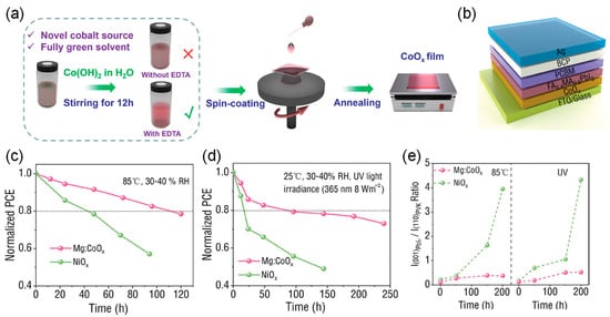 (a) Schematic diagram of the solution processing method used for CoOx preparation. (b) Schematic diagram of a complete PSC. (c,d) Thermal stability and UV stability of PSCs based on Mg:CoOx and NiOx HTLs under 85 °C aging and continuous UV exposure (365 nm, 8 W·m−2) with approximately 40% relative humidity. (e) Change in the ratio of peak intensities of (001) PbI2/(110) perovskite (PVSK) in perovskite films based on Mg:CoOx and NiOx HTLs under 85 °C aging and continuous UV exposure (365 nm, 8 W·m−2) with approximately 40% RH. Reproduced with permission from [95], Copyright 2025, Wiley-VCH GmbH.
