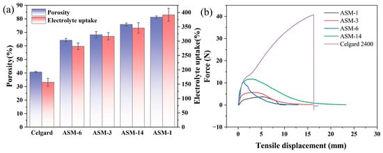 The porosity of the separators was measured using the n-butanol uptake method. The commercial Celgard separator exhibited a relatively low porosity of only 40.82%, whereas ASM-1 showed a significantly higher porosity of 81.27% (Figure 6a). With increasing PS content, the porosities of ASM-3 and ASM-6 decreased to 68.23% and 64.21%, respectively, indicating that a higher PS content leads to reduced porosity. This indicates that, within a certain range, increasing the PS content leads to a decrease in the porosity of the separator, primarily due to the significant increase in fiber diameter. However, all separators prepared via the centrifugal spinning method exhibited higher porosity than the commercial Celgard 2400 separator. This also suggests that separators fabricated via centrifugal spinning can absorb more electrolyte, which facilitates faster ion transport. Furthermore, with the addition of PMMA, the porosity of ASM-14 increased to 75.87%, enabling greater electrolyte uptake. This observation is consistent with the findings reported by Yanilmaz [42].