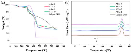 The thermal decomposition and carbon residue rates of the PAN/PS/PMMA fiber membrane and commercial Celgard separator were investigated in the temperature range of 20–800 °C. The TGA curves are shown in Figure 8a. All ASM membranes exhibited a glass transition. The commercial Celgard 2400 membrane showed significant thermal decomposition around 300 °C, and it was completely decomposed around 440 °C. At 800 °C, the residual mass retention was less than 7%. In contrast, the thermal weight loss range of the PAN/PS/PMMA fiber membranes was between 290 and 460 °C. The weight loss of ASM-1 occurred most rapidly between 290 °C and 300 °C, with the accelerated decomposition rate attributed to the cyclization reaction of the nitrile groups in PAN [51]. The weight loss of ASM-3 and ASM-6 primarily occurred in two stages: 290–300 and 380–460 °C. In the first stage, the accelerated decomposition rate was attributed to the cyclization reaction of the nitrile groups in PAN, while in the second stage, the increased decomposition rate was due to the degradation of PS. Typically, PS begins to degrade between 330 and 380 °C. Around 450 °C, PS molecular chains depolymerize, producing monomers and oligomers that volatilize, leading to thermal loss. For ASM-14, weight loss mainly occurred between 290 and 460 °C. Throughout this range, the thermal decomposition rate was steady without significant fluctuations. When the temperature reached 800 °C, the final carbon yield for ASM-1, ASM-3, ASM-6, and ASM-14 were 27.79%, 33.89%, 30.31%, and 31.45%, respectively. This suggests that increasing the PS content can improve the residual mass retention, benefiting the thermal stability of the PAN/PS/PMMA fiber membrane. After incorporating PMMA into the blend, the carbon yield decreased, as PMMA completely decomposed at this temperature [50].