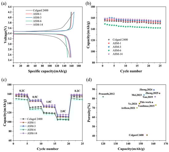 The charge–discharge performance of the fiber membranes under high current rates was evaluated. As shown in Figure 9c, the rate performance test revealed that the battery assembled with ASM-14 delivered discharge capacities of 160, 148, 136, and 116 mAh/g at current rates of 0.2, 0.5, 1.0, and 2.0 C, respectively. These values were higher than those of the Celgard separator (155, 133, 120, and 106 mAh/g), ASM-1 (157, 145, 132, and 111 mAh/g), ASM-3 (159, 146, 133, and 113 mAh/g), and ASM-6 (150, 129, 118, and 106 mAh/g). This enhanced rate performance is attributed to the incorporation of PMMA in ASM-14, which exhibited good compatibility with lithium and a strong affinity toward the electrolyte, thereby promoting greater electrolyte retention and improving battery performance under high current densities.