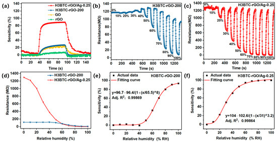 The sensitivity (a) of rGO, GO, H3BTC-rGO-200, and H3BTC-rGO/Ag-0.25 toward 50% RH. Successive response curves of the (b) H3BTC-rGO-200- and (c) H3BTC-rGO/Ag-0.25-based sensors exposed to 0~100% RH and the (d) corresponding resistance values of the H3BTC-rGO-200- and H3BTC-rGO/Ag-0.25-based sensors under 0~100% RH. The fitting curve of (e,f) sensitivity–relative humidity.