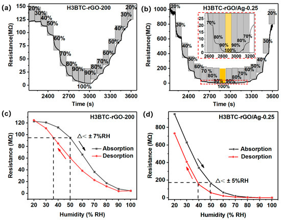 Low hysteresis is an important factor for the high efficiency of humidity sensors [4]. The sensors were placed in a humidity chamber, and the humidity was increased from 20% RH to 100% RH and then decreased to 20% RH, with a step of 10% RH. The resistance variations in the H3BTC-rGO-200- and H3BTC-rGO/Ag-0.25-based sensors are shown in Figure 6a,b. The H3BTC-rGO/Ag-0.25-based sensor exhibits a hysteresis of less than ±5% RH (Figure 6d), while the H3BTC-rGO-200-based sensor shows a hysteresis of ±7% RH (Figure 6c). As shown in Figure 4c and Figure 6b, stable electrical signals can be observed in the sensing process over a wide humidity range, indicating that H3BTC-rGO/Ag-0.25 has great potential for application in full humidity sensors.