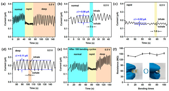 With the development of wearable devices, new demands are being placed on flexible sensors for respiratory monitoring. The normal, rapid, and deep breathing rates of adults are approximately 12–20 times/min (3–5 s, one cycle), >20 times/min (<3 s, one cycle), and <12 times/min (>5 s, one cycle), respectively [47]. As shown in Figure 7a, simulated breathing tests were performed with three types of breathing (normal, rapid, and deep) using the detection device and measurement unit (Figure S7). The experimenter (a healthy 24-year-old female volunteer) first performed a normal breathing test and then performed a rapid breathing test after running 2 km, as well as imitated deep breathing by breathing slowly. The cycle of one rapid breath and one deep breath is approximately 1.6 s and 5 s, respectively, compared to that of normal breathing (3 s) (Figure 7b–d). There is also a clear difference in the breathing rate between normal, rapid, and deep breathing. Interestingly, the depth of breathing is at the same level (Figure 7a). Furthermore, the sensor maintained stable performance in the simulated breathing tests for normal, rapid, and deep breathing patterns after 100 bending cycles (Figure 7e). This confirms its reliability across diverse respiratory scenarios. Following 100 bending cycles, the sensor exhibited less than 9% resistance variation at 55% RH (Figure 7f), confirming its mechanical stability.