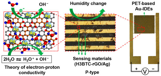 The humidity sensing mechanism of H3BTC-rGO/Ag is based on the change in electrical properties during the adsorption/desorption process. As shown in Figure 8, H3BTC-rGO/Ag, as a sensing material, was deposited onto PET-based Au-IDEs. H3BTC-rGO, with high conductivity, acted as electronic/charge transfer channels, while the Ag nanoclusters acted as the catalytic site. The introduction of carboxyl-rich organic molecules into graphene can reduce the conductivity of the material. At low humidity (RH < 10%), water molecules interact with H3BTC-rGO/Ag through diffusion. This hinders the movement of electrons and ions, resulting in a high resistance state (>1220.64 MΩ) of the sensor. As humidity increases, the adsorbed water molecules on the surface of the H3BTC-rGO/Ag reduce the resistance from 1220.64 MΩ to hundreds of MΩ through chemical adsorption. After reaching RH > 60%, the resistance value drops below 73.26 MΩ, and the water adsorption mechanism becomes primarily physical. The number of hydrated ions (H3O+) reaches the upper limit, and the reduction in resistance mainly depends on the change in the content of adsorbed water [48]. The carboxyl-rich organic molecules modified graphene with good conductivity, and the sufficient exposure of Ag nanocluster activity sites should be responsible for the enhanced humidity sensing performance in H3BTC-rGO/Ag.