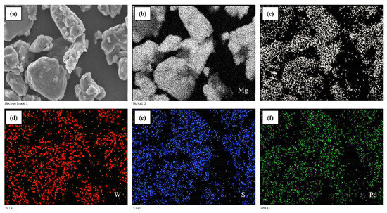 The different quantities of WS2 NT/Pd were added to all of the prepared AZ31-WS2 NT/Pd composites throughout the 8 h ball milling process. The surface morphology of ball-milled AZ31-8WP before and after hydrogenation was observed by FE-SEM and presented in Figure 3. The powder samples contain an irregular morphology due to the highly uneven force generated during the ball milling process. The particle size was measured for rasped pristine AZ31 samples and is in the range of 80 to 100 μm. When the content of WS2 NT/Pd increased from 0 to 8 wt.%, the average particle size of the AZ31-WS2 NT composites decreased to 19.7, 16.4, and 15.3 μm, for 0, 4, and 8 wt.%, respectively. This indicates that the particle size of the AZ31 alloy with different quantities of WS2 NTs is not noticeably different. Additionally, the elemental dispersion mapping shown in Figure 4, the elements Al, W, S, and Pd in the ball-milled sample are evenly distributed on the magnesium alloy powders with the scale of 10 μm. The uniform distribution serves as one of the significant factors for improving the diffusion of hydrogen along the Mg-alloy interfaces. The ball milling of AZ31 magnesium composite results in a reduction in grain size and creates several distinct defects, which allow the hydrogen atoms to diffuse more quickly [37].