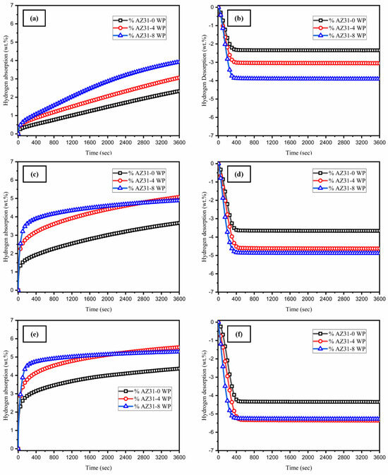 The isothermal hydrogenation and dehydrogenation properties of AZ31 with different WS2 NT/Pd content were studied at 375 °C, and the results are shown in Figure 6. The addition of WS2NT/Pd accelerates the rate of absorption and desorption. At the temperature of 375 °C, AZ31-0 WP, which has no additives, absorbed 6.31 wt.% hydrogen as the highest, while 6.07 wt.% hydrogen was absorbed for AZ31-4 WP and 5.60 wt.% hydrogen for AZ31-8 WP at the same parameter conditions (Figure 6a). AZ31-0 WP desorbed 6.24 wt.% in 10 min at the fixed temperature level, while AZ31-4 WP desorbed 6.07 wt.% and 5.58 wt.% hydrogen for AZ31-8 WP. The observations illustrated that increasing the quantity of WS2NT/Pd content significantly enhanced the hydrogenation and dehydrogenation kinetics of the composites. In addition to that, increasing the quantity of catalyst influences the hydrogen storage capacity significantly. Although the catalyst significantly enhances the hydrogenation reaction kinetics, it does not directly contribute to hydrogen storage. Instead, the excessive catalyst content reduces the volume fraction of reactive magnesium available for hydrogen uptake, thereby limiting the overall storage capacity. The same parameters have been maintained during ball milling of the composite. Therefore, the performance of the different composites was mainly attributed to the varying WS2-NT/Pd content. It is a fact that AZ31-4 WP contained fast kinetics with minimal loss of hydrogen storage capacity.