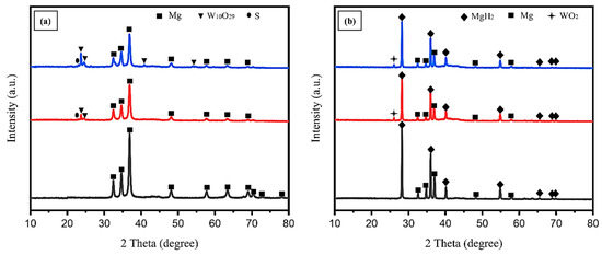 The above-mentioned kinetic results show that the addition of WS2 NT/Pd composite to the AZ31 magnesium alloy significantly enhanced the rate of hydrogen absorption and desorption. The phase transformations of two different states, such as ball milled and after hydrogenation, were investigated by XRD, and the results are presented in Figure 7. After the ball milling process, the identified Mg phase has sharp peaks for AZ31 magnesium alloy. While adding WS2-NT/Pd composite, the Mg peak intensity decreased with the increment of catalyst content. Moreover, the W10O29 and S (sulfur) phases identified individually show that during the ball milling process, the added materials react with the residual oxygen. The WO2 phase was identified after hydrogenation cycles. The presence of numerous oxygen vacancies on WO2.9 increases the electronic conductivity properties and also offers more sites for activation [38]. Because it was believed that the presence of WO2.9 could significantly facilitate the H2 molecules’ dissociation on the surface to enhance the absorption and the presence of transition metal oxide such as WO2 plays the role of catalyst during desorption that weaken the bond strength between hydrogen and magnesium enhance the rates of the hydrogen desorption in the storage materials system [39]. Due to the conceivable low quantity, the Pd was not identified in the XRD patterns of the AZ31-WS2 NT/Pd composite before and after hydrogenation. Additionally, the residual magnesium presented in the three different compositions demonstrates that the composites have not reached their actual capacity of hydrogenation in 60 min. The comparative research on chalcogenides indicates that the presence of sulfur compounds in magnesium hydrogenation may not have a favorable effect on the hydrogenation capacity’s performance [40]. After the hydrogenation MgH2 phase has been formed with a sharp crystalline structure.