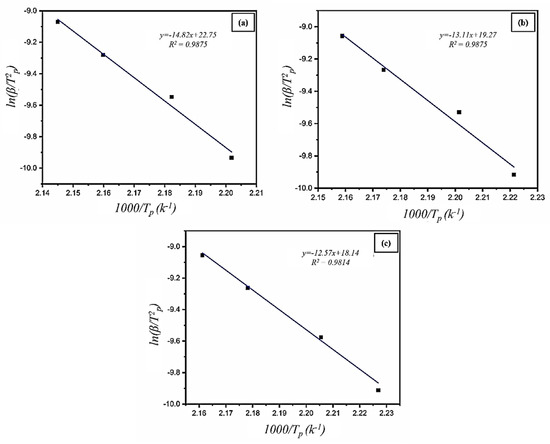 Kissinger plots of (a) AZ31-0WP, (b) AZ31-4WP, and (c) AZ31-8WP obtained from DSC measurement.