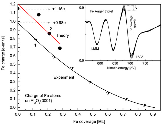 The latter allows one to determine the excess charge the Fe atoms acquire upon adsorption on α-Al2O3(0001). The corresponding plot of the charge value of the Fe adatom versus Fe coverage is shown in Figure 4 (curve 1). It is seen that, unlike the trend expected from the work function versus coverage plot (Figure 3, curve 2), the Fe atoms acquire positive charge, i.e., the chemisorption bond is polarized towards the alumina substrate. The inconsistency between the AES and the work function results may be attributed to the fact that, unlike in the metallic substrate, when the dipolar model prevails, for band gap materials, like alumina, the work function is an interplay between the band bending and Fermi level shift upon metal adsorption [45,47]. As seen in Figure 4 (curve 1), the charge of Fe adatoms gradually decreases with the increasing coverage. The solid line, as the best fit to the experimental points, approximated to zero coverage (θ → 0), gives an estimated value of the charge of single Fe atom adsorbed on the surface of α-Al2O3(0001), which is +0.98e.