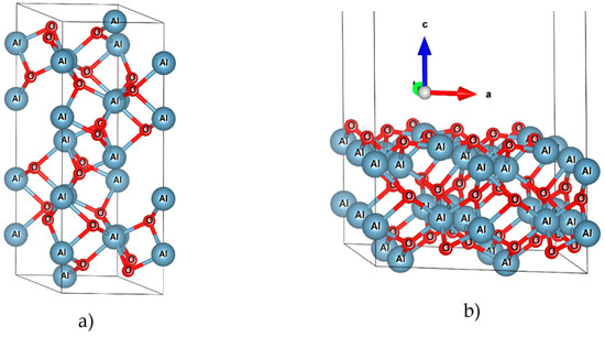 To theoretically assess this value, first, the optimized structure of the bulk phase of α-Al2O3(0001) and the slab model of the Al2O3(0001) surface were built (Figure 5). The optimized lattice constants of the bulk structure are a = b = 4.842 Å and c = 13.177 Å, which are comparable to the experimental values of a = b = 4.754 Å and c = 12.990 Å [48] with less than a 2% error. Each oxygen atom in the bulk structure of Al2O3 is bonded to four Al atoms. All four bond lengths are not equal; two bond lengths (2.005 Å) are longer than the other two bond lengths (1.88 Å). These bond lengths are slightly longer than those in the experimental structure, which has values of 1.99 Å and 1.87 Å, respectively. The optimization of the slab model shows that the outermost surface layer reconstructs so that the oxygen atoms form only three bonds with different bond lengths to the Al inner layer. The bond lengths are 1.73 Å, 1.81 Å, and 1.90 Å, which are smaller than the bond lengths in the bulk structure.