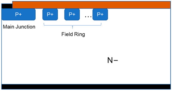 The devices used in the experiment were manufactured with the planar SiC MOSFET process, based on an n-type 4H-SiC epitaxy. The thickness and doping concentration of epitaxy were 11.5 μm and 9.5 × 1015 cm−3, respectively. Pwell, N+, and P+ regions were formed with high doses of aluminum and nitrogen implantation. In this work, the FFR structure was designed for the termination area because it is easily processed, and it is formed with P+ aluminum implantation. The structure of the termination is shown in Figure 1.