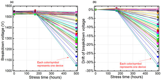 In this HTRB test, after 500 h of testing, we found that the BV drops for most of the SiC MOSFET devices. As shown in Figure 3a, after 500 h, the BV of the 80 pcs devices declined in varying degrees. Their values dropped from the initial 1500 V to around 1000 V, while the maximum drift proportion after 500 h is more than 30%, which is shown in Figure 3b. The AECQ-101 failure criterion requires that the drift in breakdown voltage does not exceed 20% after testing. Obviously, this test can be judged as a failure based on this criterion, so the experiment ended prematurely after 500 h.