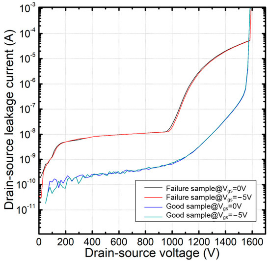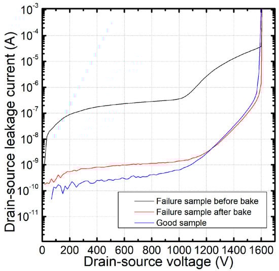 To further investigate the failure mechanism, the failure samples were baked under high temperatures. Their BV curves were tested before and after baking. The curves were also simultaneously compared with those of the good sample, the result of which are shown in Figure 6. We can find, for the failure samples before baking, that the Idss current is higher than that of the good sample, which is consistent with Figure 4. However, after 2 h of baking at 175 °C, the failure sample BV curves were recovered, as the Idss leakage decreased and their curves were almost the same as those of the good sample.