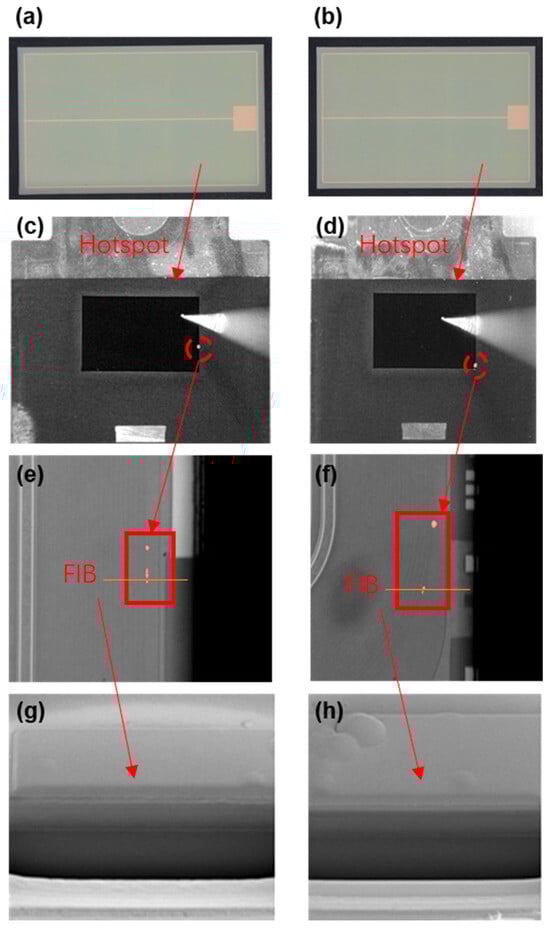 To confirm the failure position, two failure samples were decapped, and hotspot analyses were performed on them. Figure 5a,b show the Optical Microscope (OM) pictures, which were observed from backside of the chips. No abnormalities were found from the OM results. However, the following hotspot analysis, shown in Figure 5c,d, implies that there is leakage current on the edge of the chip where the termination area is located. This result confirms our speculation: the Idss leakage current increase and BV drop occurred because of termination degradation. By enlarging the hotspot area, we can further find that the leakage current is concentrated on the outer termination ring. Focused Ion beam (FIB) analysis was then implemented on the hotspot (the orange line in Figure 5e,f to see whether there were abnormal structures or particles that could lead to increased leakage current. The results are shown in Figure 5g,h, which indicate that there are no abnormal structures or defects inside the hotspot.