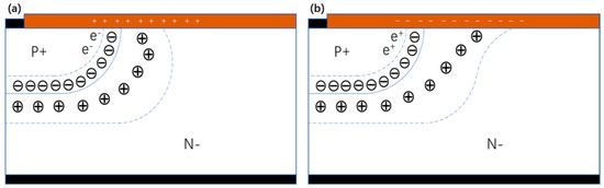 Combining the analysis information above, we can conclude that the root cause for failure in the leakage current increase and BV drop after the HTRB test is trapped charges in the SiC/SiO2 interface. The trapped charges in the interface influence the electric potential and space charge area, thus changing the electric field distribution and breakdown characteristics. As shown in Figure 7, if there are positive charges in the interface layer, negative charges are induced in the main junction, and then the electric field is crowed at the main junction, which leads to early breakdown of the main junction. Meanwhile, if there are negative charges in the interface layer, positive charges are induced in the main junction, which alleviates the electric field at the main junction. However, it will increase the electric field of the termination edge area, which could also lead to device leakage, current increase, and device characteristic degradation. Combining the failure analysis results, we can conclude that, during this HTRB test, there were negative charges trapped in the SiC/SiO2 interface of the termination area, which increased the termination leakage current and, thus, led to BV drops. After high-temperature baking, the charged traps were recovered, then the electric field distribution returned to the original design. Thus, the leakage current and BV curves recovered, as well.