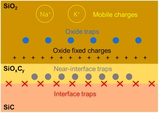The defects in and near the SiC/SiO2 interface, and their impacts on SiC MOSFET performance, have been reported in the literature [30,31,32,33,34]. Based on the distribution locations, they are classified as interface traps, near-interface traps, oxide traps, oxide fixed charges, and mobile charges. They are shown in Figure 8 below. The interface traps, located in the SiC/SiO2 interface, are caused by carbon cluster, carbon dangling bonds formed during the oxidation process. Near-interface traps, which exist in the transition layer SiOxCy, between SiC and SiO2, are primarily associated with oxygen vacancy defects in the oxide. Near-interface traps close to the interface can capture carriers through direct tunneling or interface state-assisted tunneling.