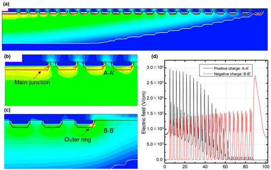 Electric field distribution under positive and negative trapped charges. (a) Termination structure (b) Enlarged view of main junction (c) Enlarged view of outer ring (d) Electric field distribution under both positive and negative charges.
