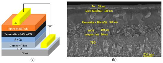 An architecture of the perovskite device (a) and an SEM image of the cross-sections of the perovskite device (b).
