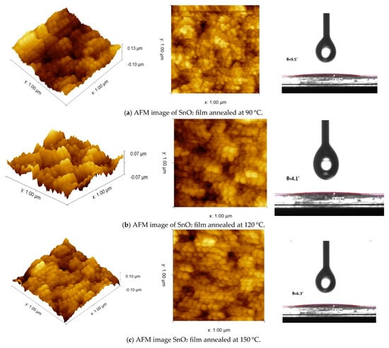 A contact angle (θ) measurement was used to measure the “surface wettability (hydrophilicity).” The surface energy properties of phase separation in the perovskite active layer are affected by the uniformity across the ETL materials. Measuring the contact angle θ provides an indication of the surface energy of each layer. The low θ of the ETL demonstrates a good matching between the ETL and the perovskite active layer, which enhances the perovskite film morphology properties [33]. It is shown in Figure 2 that the θ of SnO2 annealed at 120 °C is 4.1°, while the θ values of SnO2 treated at 90 °C and 150 °C are 9.5° and 6.3°, respectively. It is found that SnO2 heated at 120 °C achieved a low contact angle and high hydrophilicity, which can be attributed to the decrease in the surface roughness of the SnO2. Since SnO2 ETL acts as a seed layer for the perovskite deposition, the surface roughness and wettability of SnO2 will affect the topography and grain size of the perovskite active layer [15].