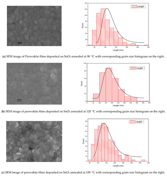 Image J and Origin 9 software (version 1.54p) were used to compute the average grain size and draw a histogram curve. Figure 3 displays the SEM images of the surface morphology of perovskite active layers deposited on SnO2 films annealed at 90 °C, 120 °C, and 150 °C. The following histogram displays the average grain size for each annealing temperature. It is found that the perovskite film deposited on SnO2 annealed at 120 °C showed a uniform structure with an average grain size of 180 nm, which is larger than the grain size of other perovskite films deposited on SnO2 annealed at 90 °C and 150 °C. The average grain sizes of perovskite film deposited on SnO2 annealed at 90 °C and 150 °C are 115 nm and 130 nm, respectively, as shown in the histogram of Figure 3. We found that perovskite films with a large grain size produce a low series resistance (Rs), resulting in improved efficiency of the device [32]. Our results showed that the perovskite active layer deposited on SnO2 annealed at 120C has a larger grain size and fewer defects than other perovskite films deposited on SnO2 annealed at 90 C and 150C. Larger grain size leads to enhancement in carrier conduction properties [34].